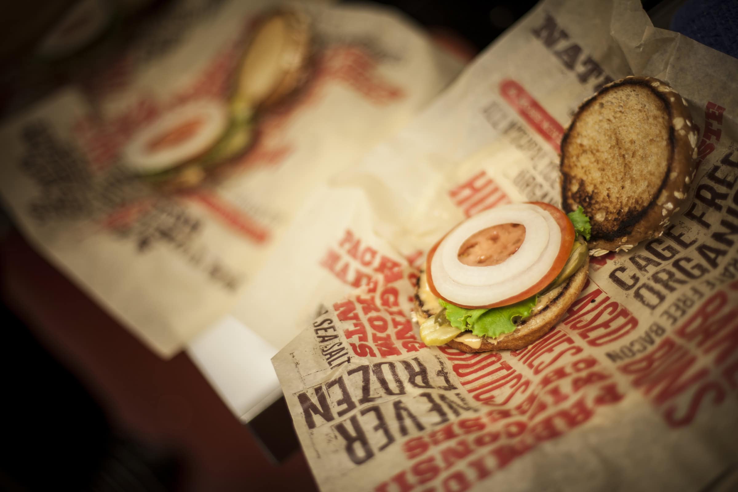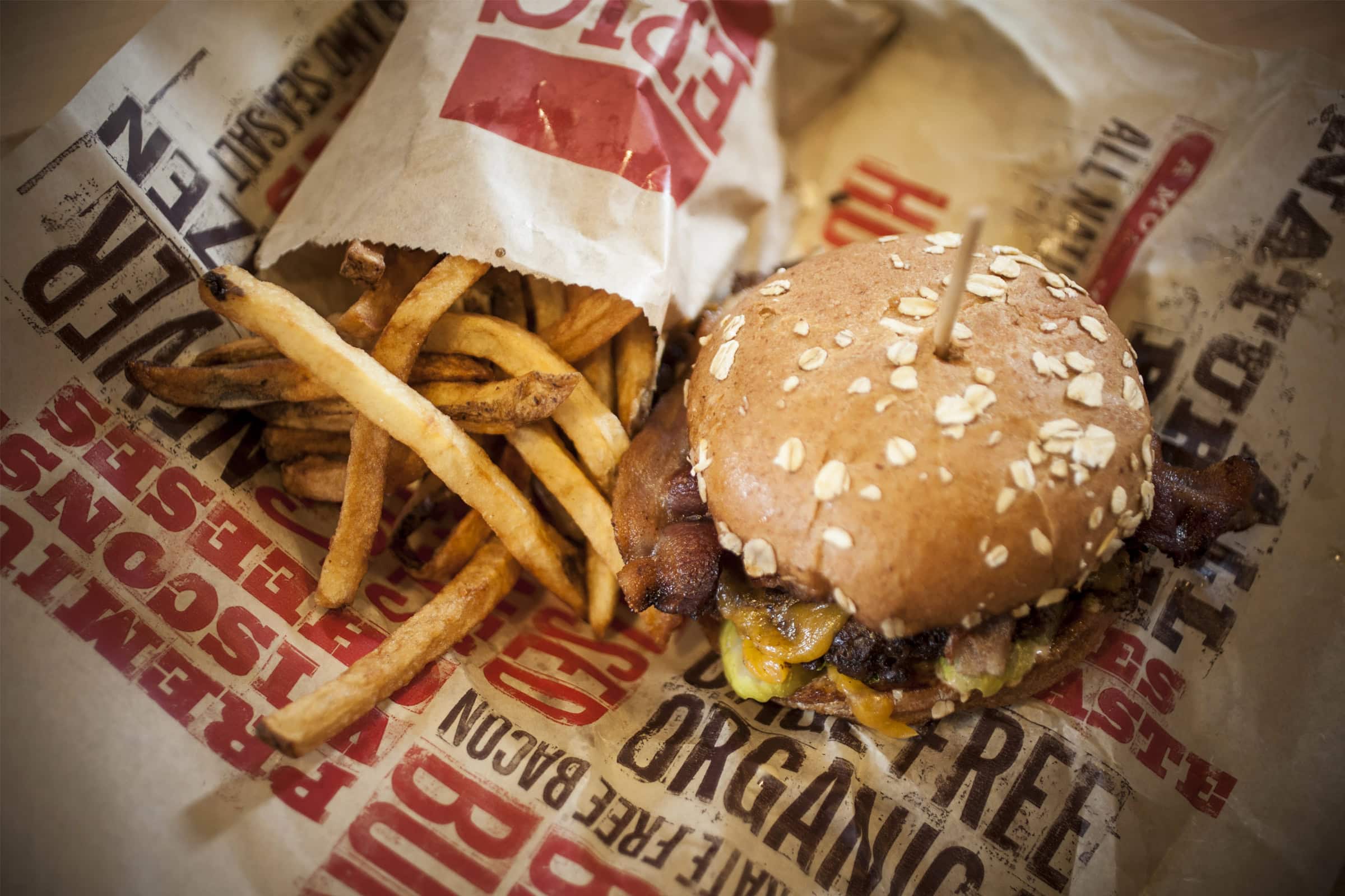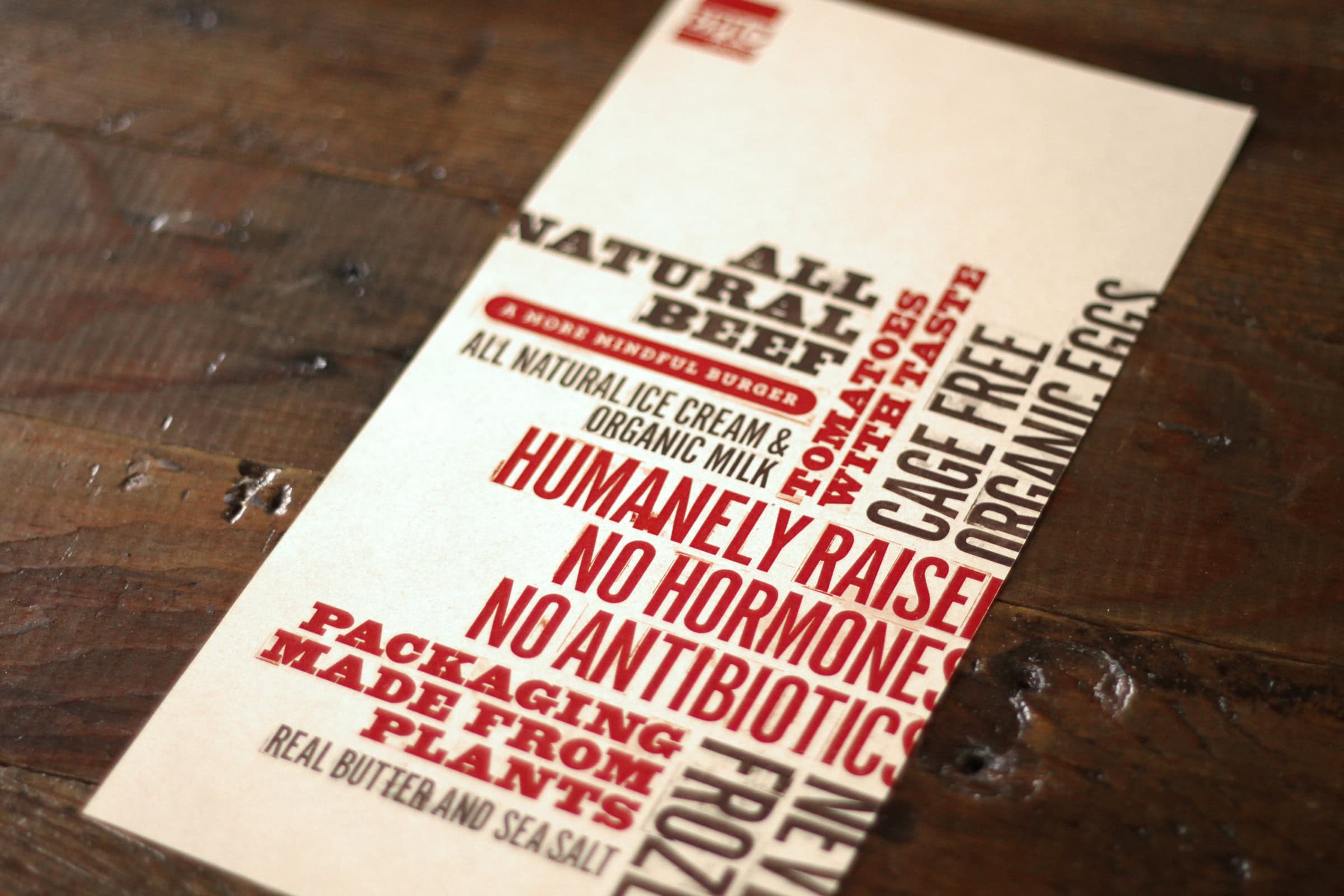 From store design and signage to packaging and branded materials, each location has been designed to convey the eatery’s focus on freshness and an experience that is more full-service than fast food. Earthy print materials, custom designed lighting fixtures, paintings and menu boards communicate the authenticity of this quickly expanding “better burger experience.”