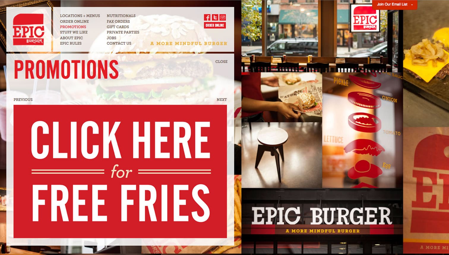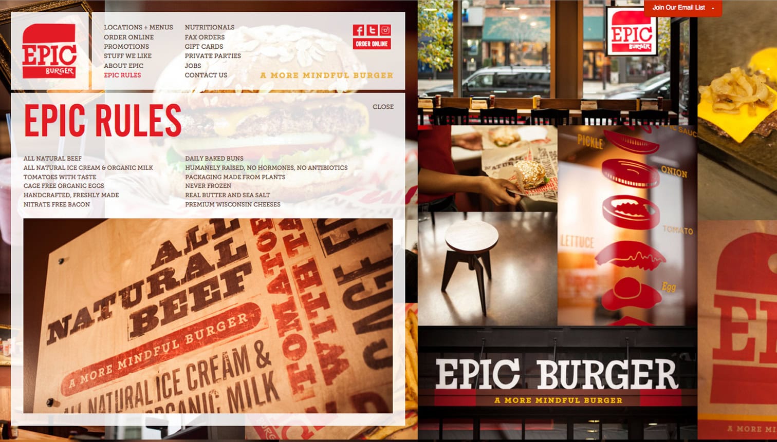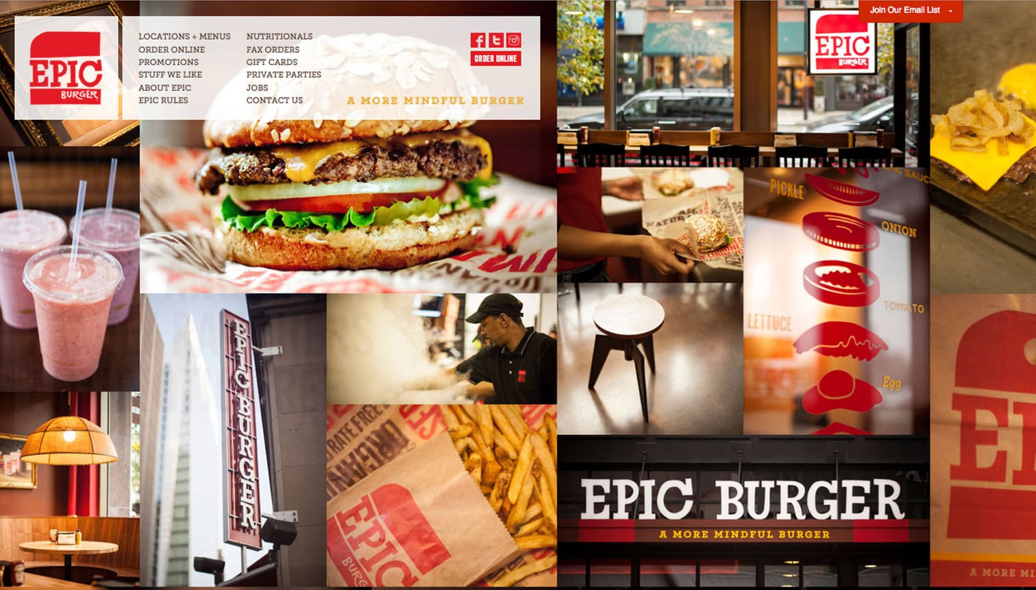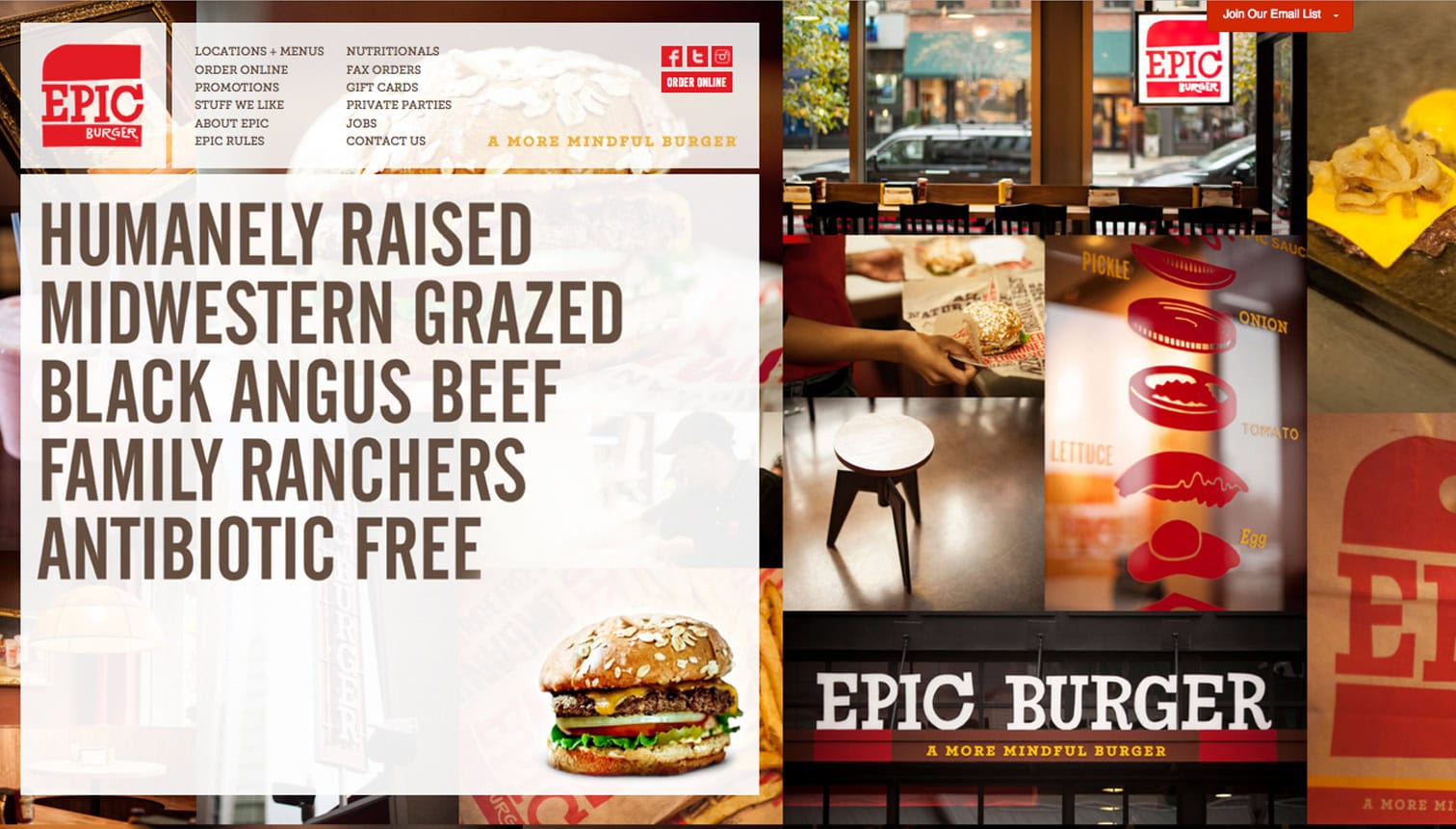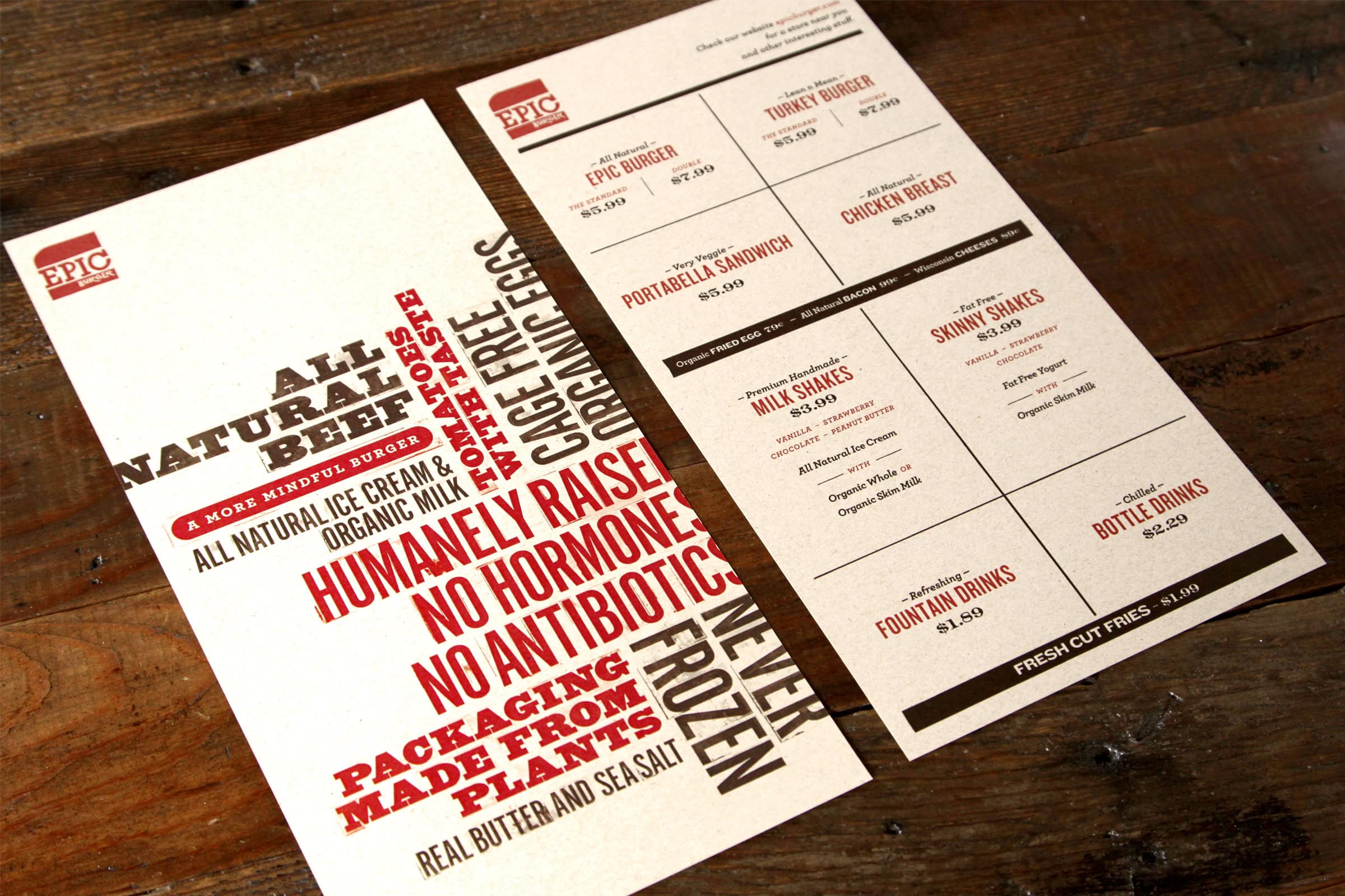 This fast casual burger chain features hand-crafted burgers, all-natural ingredients and eco-friendly takeout containers made from plants. Through an on-going partnership, G+A were stewards of the brand during Epic Burger’s first decade in business, designing every touchpoint of the restaurant’s brand experience, while maintaining the integrity of the founder’s vision.